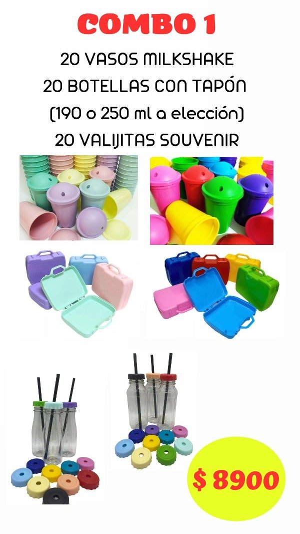 20 botellas plásticas de PET de 190 ml (Apto alimenticio, jugos, golosinas, etc.) con tapones perforados surtidos